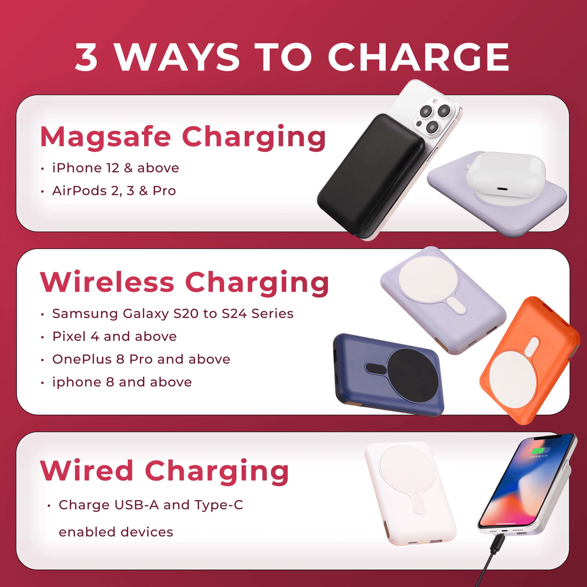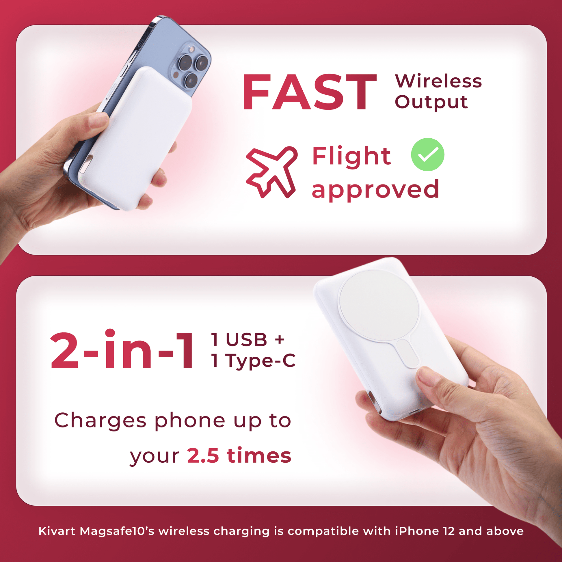 Kivart Magsafe packs a powerful 10000mAh battery with a strong magnetic hold for seamless wireless charging. Supporting three versatile charging modes, it fuels up your iPhone, AirPods, and other devices effortlessly. Compact, stylish, and ultra-safe, it’s your perfect on-the-go power companion!